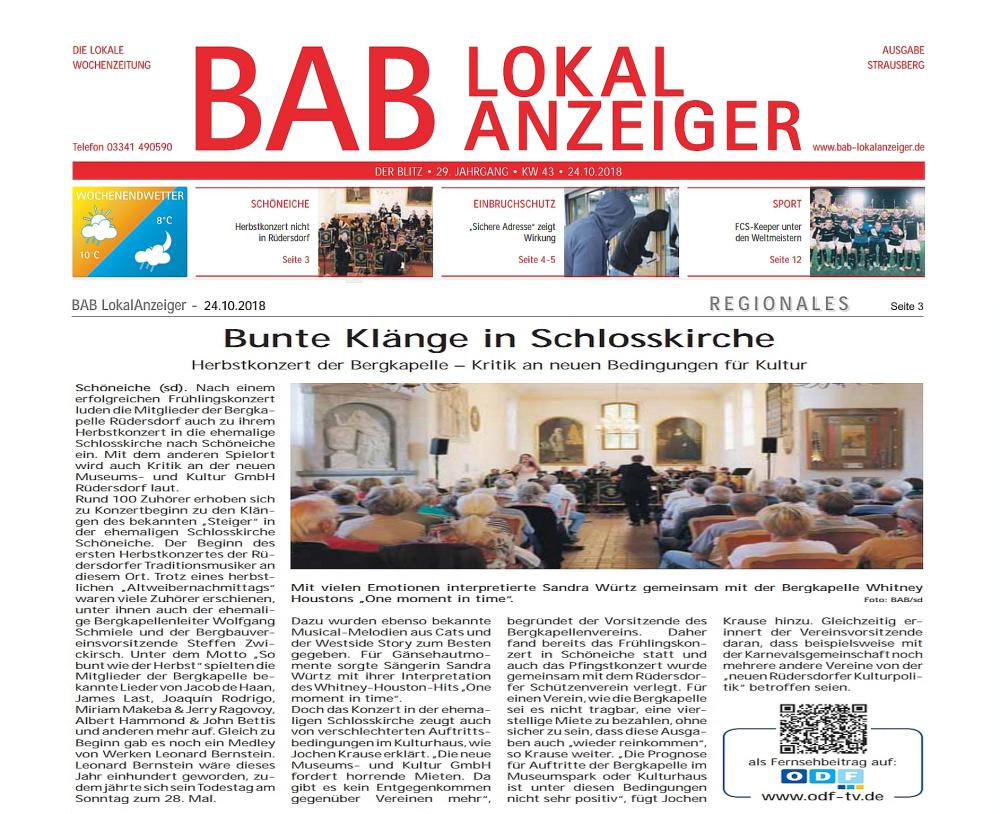 15. Oktober 2018 Eindrücke vom 1. Herbstkonzert der Bergkapelle e.V. aus der ehem. Schoßkirche Schöneiche.